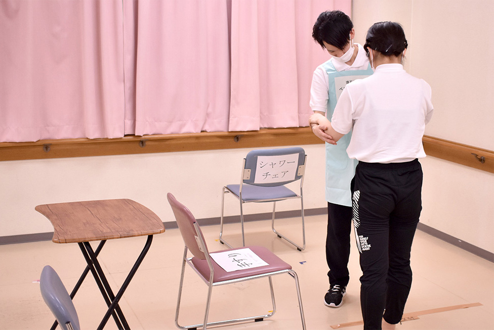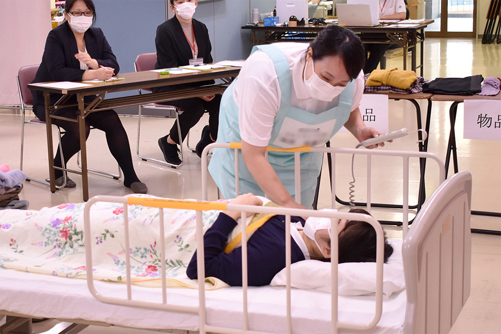 競技直前に渡されるご入居者様の情報をもとに与えられた課題の介護サービスが提供できているか審査されます。具体的には「笑顔でご入居者様とコミュニケーションがとれているか」、「提供する介護サービスの手順やスピードはご入居者様にとって適切であるか」をはじめ介護技術の安定感をポイントとして確認をします。