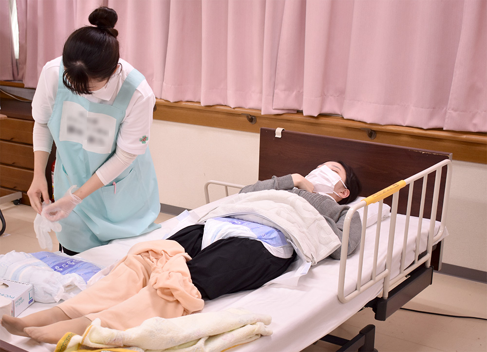 ベット上で排泄介助を行います。特にデリケートな介助でご入居者様の気持ちに寄り添うことが求められます